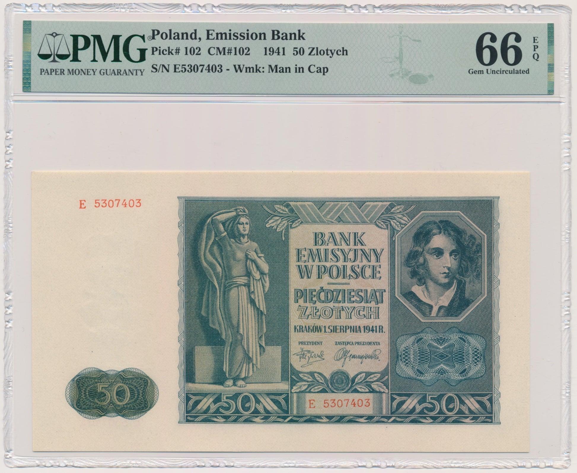 Banknot w slabie PMG z oceną PMG 66 EPQ.