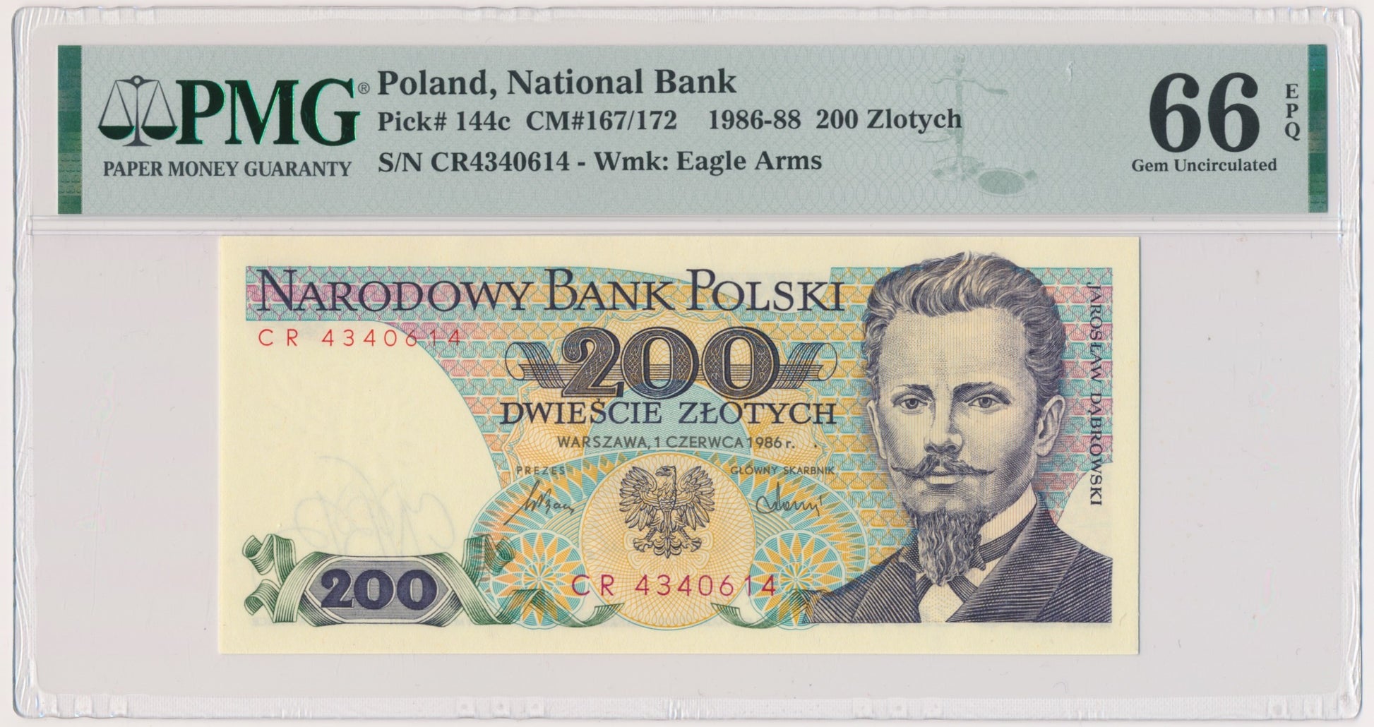 Banknot 200 złotych 1986 – CR – PMG 66 EPQ – pierwsza seria rocznika