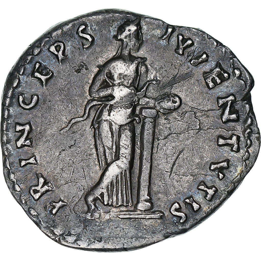 Salus stojący w prawo, oparty na kolumnie, karmiący węża paterą. Wydanie wybite w imieniu Domicjana przez Tytusa.CAESAR AVG F DOMITIANVS COS VIIPRINCEPS IVVENTVTIS3,31 gr