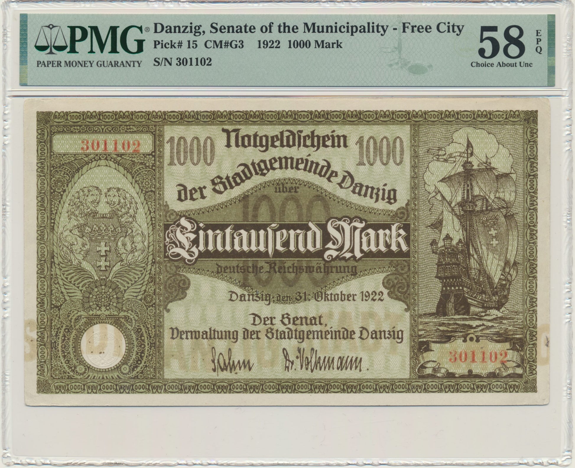 Gdańsk, Banknot 1.000 marek 1922 – PMG 58 EPQ