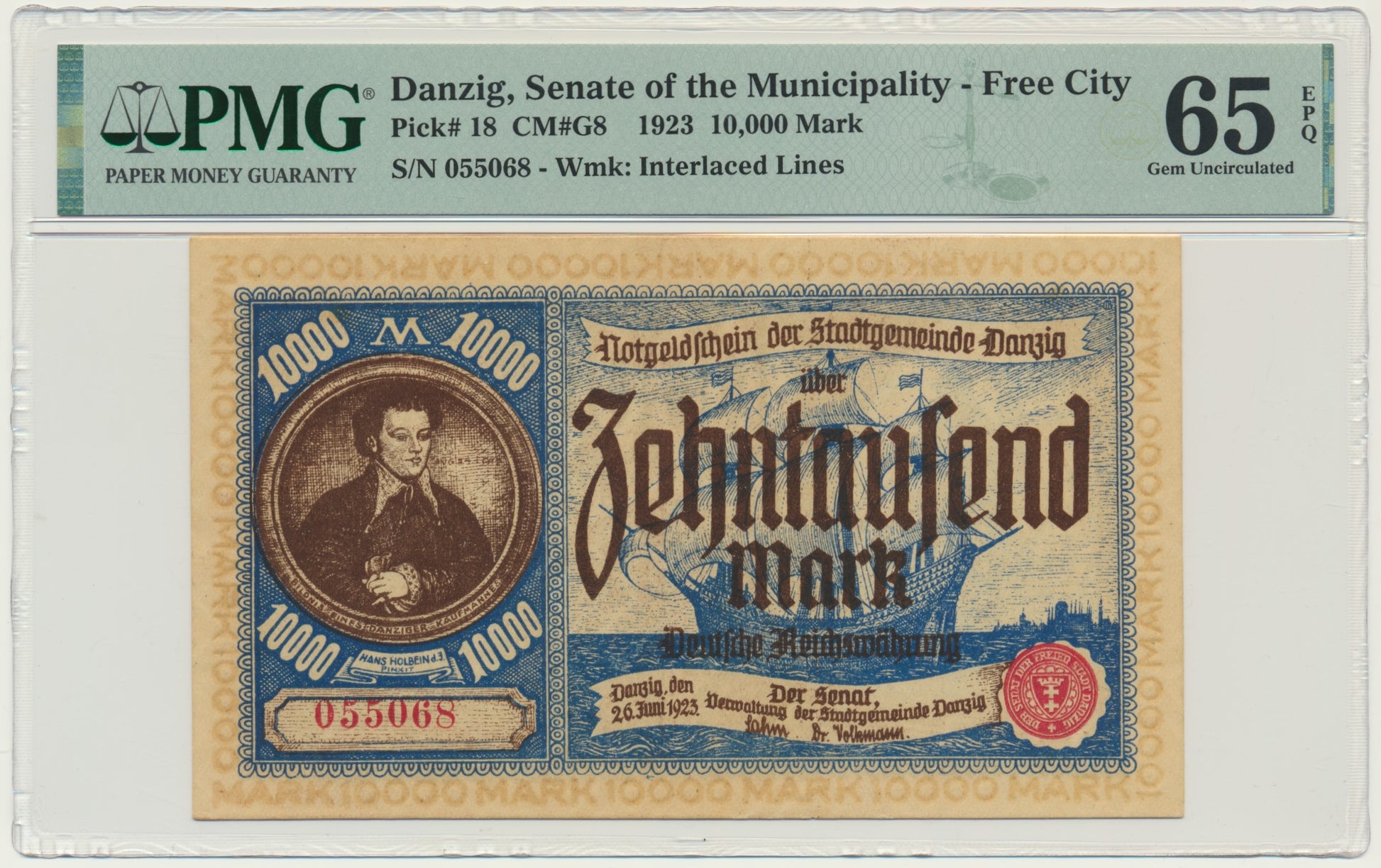 Gdańsk, Banknot 10.000 marek 1923 – PMG 65 EPQ
