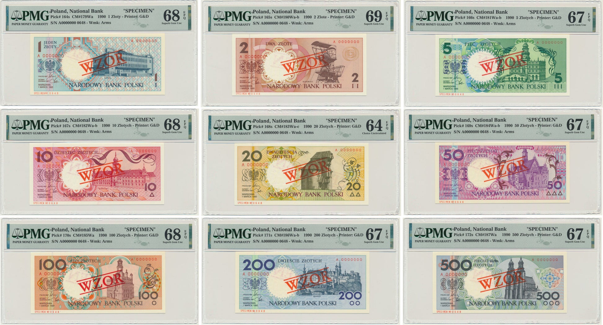 Komplet Miasta Polski z nadrukiem WZÓR/SPECIMEN No 0648 (9szt.) – PMG 64-69 EPQ