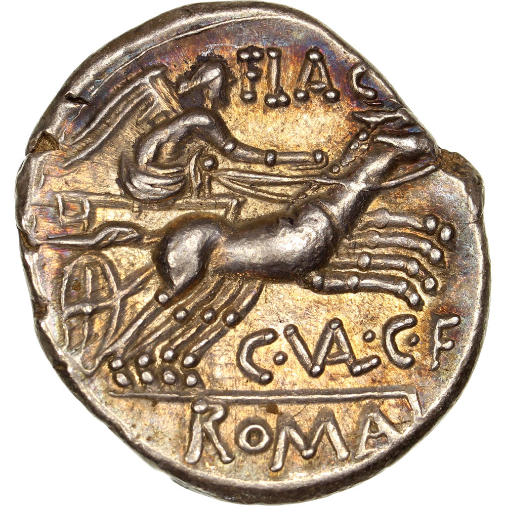 Zwycięstwo w biga, po prawej, trzymając wodze w lewej ręce i bat w prawej.C. Valerius Flaccus.FLAC - C·V͡A͡L·C·F / ROMA3,73 gr