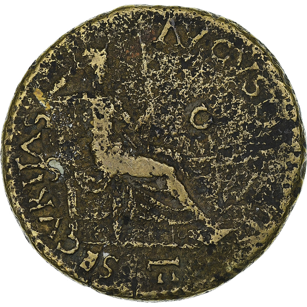 Securitas, nagi do pasa, siedzący, po prawej stronie, na tronie, z głową opartą na prawej ręce i trzymający krótkie berło w lewej; z przodu oświetlony i ozdobiony girlandami ołtarz, na którym opiera się zapalona pochodnia wsparta na bucranium. Bardzo rzadki Dupondius, jednakże stan zachowania nie pozwala rozróżnić, czy należy do typu RIC 375 czy 376, gdyż koniec legendy jest zbyt uszkodzony, aby można go było odczytać. NERO CLAVD CAESAR AVG GER P M TR P IMP P (P?)SECVRITAS AVGVSTI / S C / II13,04 gr