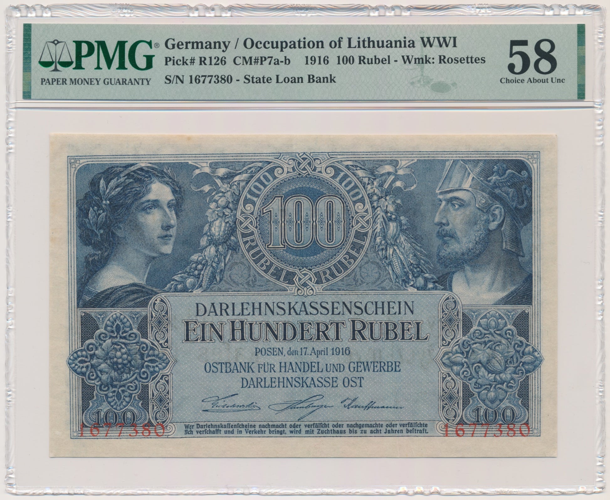 Poznań, 100 rubli 1916 – 7 cyfr – PMG 58